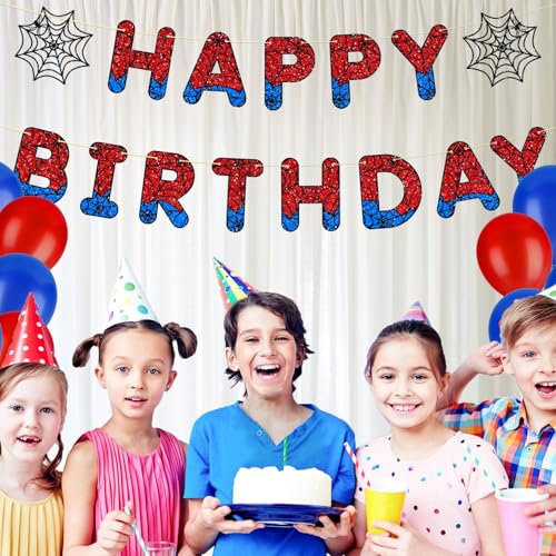 - Ufocusmi Pre-Strung Glitter Spider Themed Birthday Decorations, NO DIY Spider Happy Birthday Banner, Cool Party Supplies for Boys