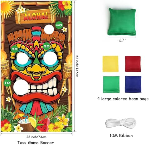 - Hawaiian Style Toss Game: The Toss Game Banner is printed with beautiful tropical element patterns and Aloha font, and comes with 4 sandbags for throwing. The colors are bright and bold, full of the summer atmosphere of tropical rainforests. Toss Game Banner is equipped with patterns such as flowers, fruits, and sunlight, making it suitable for indoor and outdoor gatherings or daily decorations.