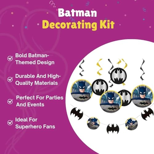 - COMPLETE SET: This pack includes 6 foil swirl decorations with cutouts and 1 garland (7 ft.), this all-inclusive Batman Decorating Kit takes the hassle out of party planning and provides everything you need for a memorable event.