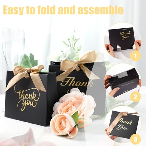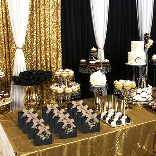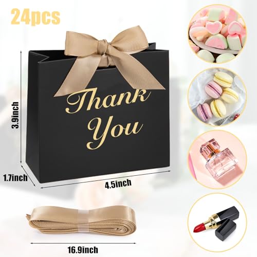 - Super Value Pack: Each set includes 24 mini treat bags (4.5 x 4 x 1.8 inches) in black, featuring two unique “Thank You” fonts in gold foil (12 of each style) and pre-cut satin bows. Compact yet stylish, they’re perfect for presenting gifts in style while saving table space