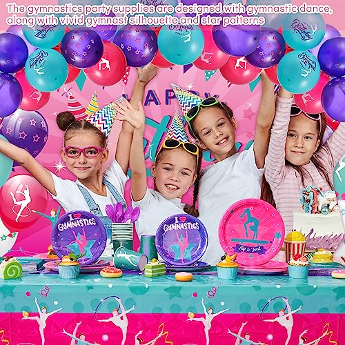 - Gymnastics Birthday Party Decorations: you will get 24 happy birthday plates (9 inch), 24 happy birthday plates (7 inch), 24 paper cups, 24 spoons, 24 forks, 24 knives, 50 paper tissues, 3 table covers, 1 backdrop, 1 white rope, 60 balloons in 3 styles, each style has 20 pieces, 1 white ribbon, 1 balloon chain and 2 balloon knotter, sufficient quantities can meet your use needs for your gymnastics party