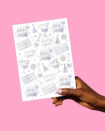 - Cheers!: two sheets with a total of 52 iridescent tattoos featuring handdrawn designs of champagne, birthday hats, martinis, starts, hearts + more that guests will absolutely love!