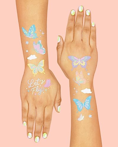 - Time To Fly: two sheets with a total of 70 iridescent tattoos featuring handdrawn designs of butterflies, clouds, stars, hearts, flowers + more that guests will absolutely love!