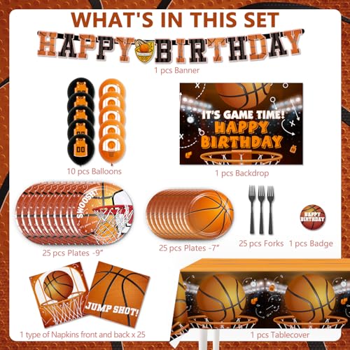 - All-in-one set: Our basketball party supplies serve 25, including 1 happy birthday banner, 12 cupcake toppers, 1 cake topper, 1 basketball backdrop, 2 basketball tablecloth, 25 cup, 10 printed balloons, 25 large 9" paper basketball plates, 25 small 7" paper plates, 25 plastic forks, and 25 paper napkins. A total of 177 pieces with cool basketball designs