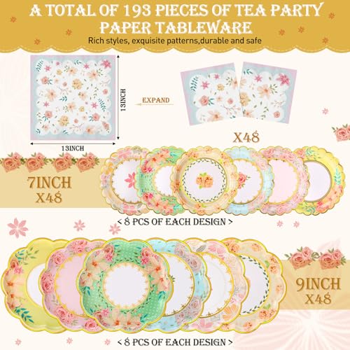 Yungyan 193 Pcs 48 Guests Tea Birthday Party Supplies Disposable Tableware Set 9 oz Paper Tea Cups with Handle, 7" 9" Paper Plates, Napkins, Tablecloth for Floral Party Wedding Baby Shower
