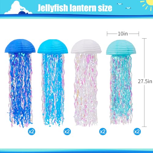 - Jellyfish Paper Lantern Sets Included – Each pack contains 8 pieces of jellyfish paper lanterns, 4 bright colors, including 2pcs sky blue, 2pcs royal blue, 2pcs blue and 2pcs white. Enough jellyfish lanterns can be used to decorate the party scene in a large area, best choice for a under the sea party decorations and under the sea backdrop decorations.