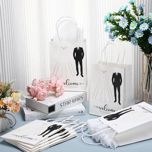 - Exquisite Wedding Dress Theme: the wedding welcome bags and tissue paper embrace distinctive wedding dress theme; The design of the gift bags is enhanced with the inclusion of white tissue paper, adding a structured and fashionable feel; The white rope handle makes it convenient for you to use; Whether you use them for guest gifts or decoration, they add an elegance that complements the romantic atmosphere of your special day
