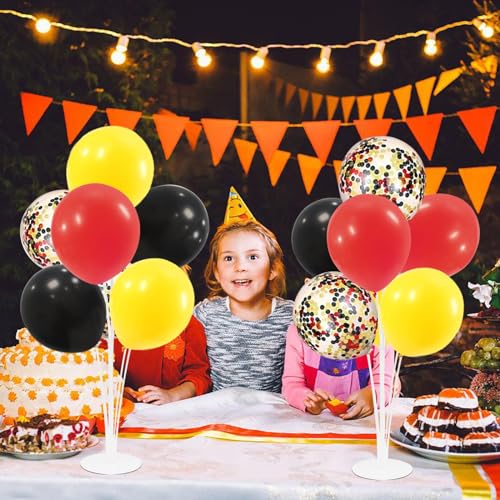 - WHAT INLCUDE: This red yellow black balloon centerpiece include 4 set balloon holders, red yellow black and confetti balloons enough for assemble 4 set. Also include balloon balloon pump, ribbons, glue dots and tying tool