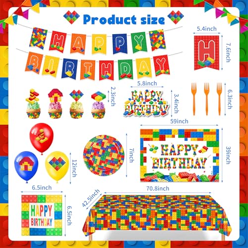 - Building Blocks Birthday Party – The Building Blocks Birthday Party set includes 1 building block birthday banner, 1 Happy Birthday cake decoration, 24 cupcake decorations, 18 balloons, 24 7-inch plates, 24 forks, 24 tissues, 1 tablecloth, and 1 background cloth. The building blocks party supplies are sufficient to satisfy your children and family and can meet most quantity needs